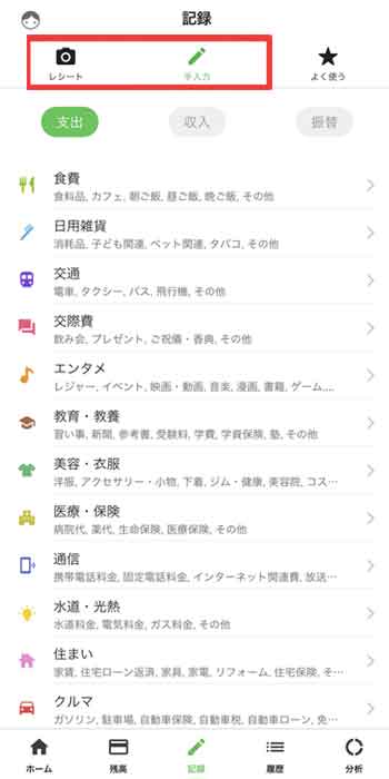 カメラをタップするとレシートの写真を撮ることができ、手入力をタップすると手入力で支出の内容を記入することができます。