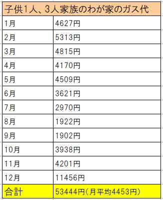3人暮らしのわが家のガス代の平均は45000円~55000円(月平均3700円~4500円)です。