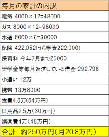 毎月の固定費や変動費に必要な基本的なお金は20万8千円(年間250万円)となっています。